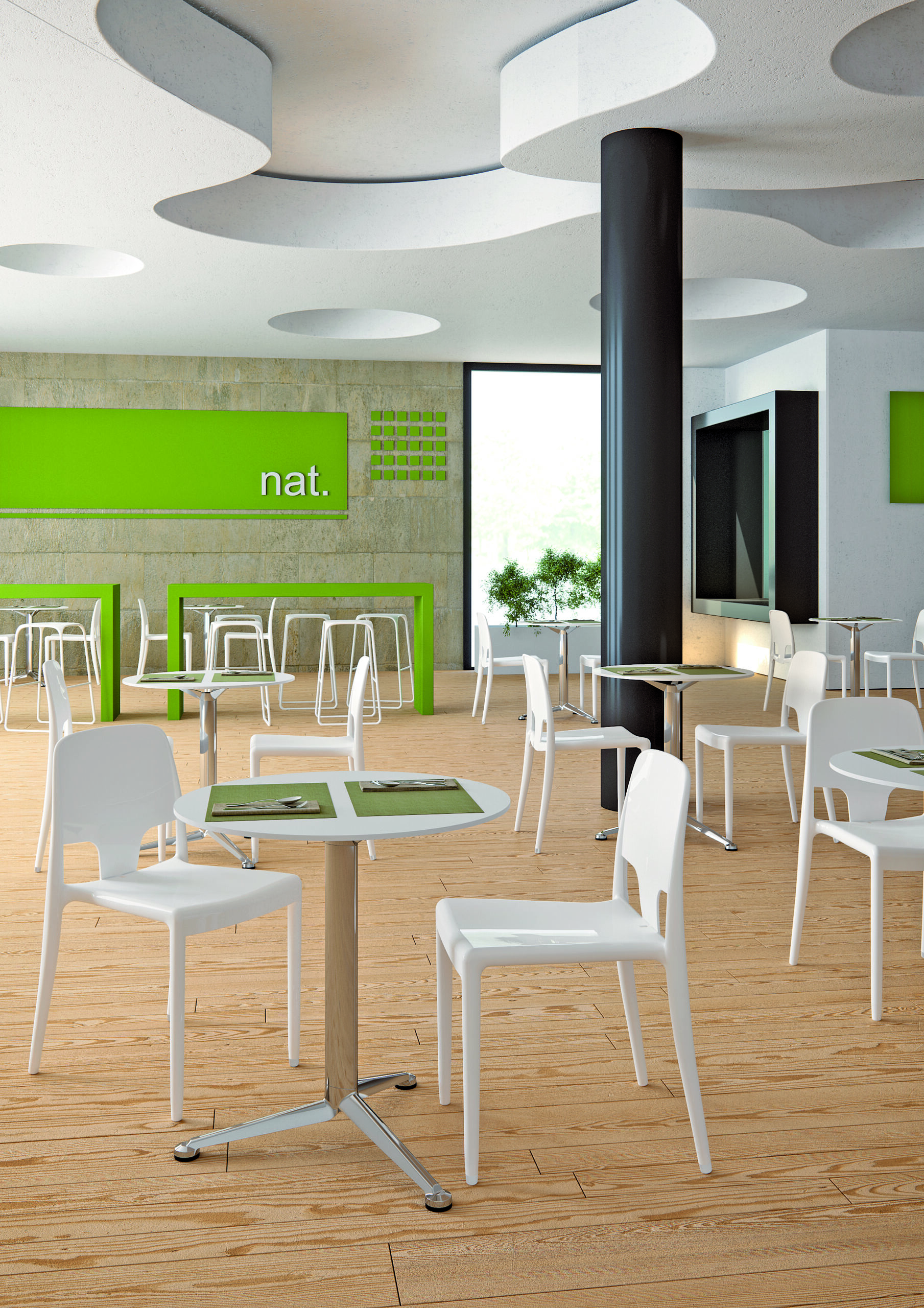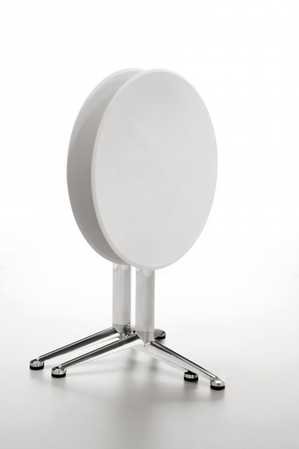 Aluminijast okvir s tremi podporami in nastavljivimi nogami. Zgornji del mize/plošča je iz polipropilena, ki je primeren tudi za uporabo na prostem.