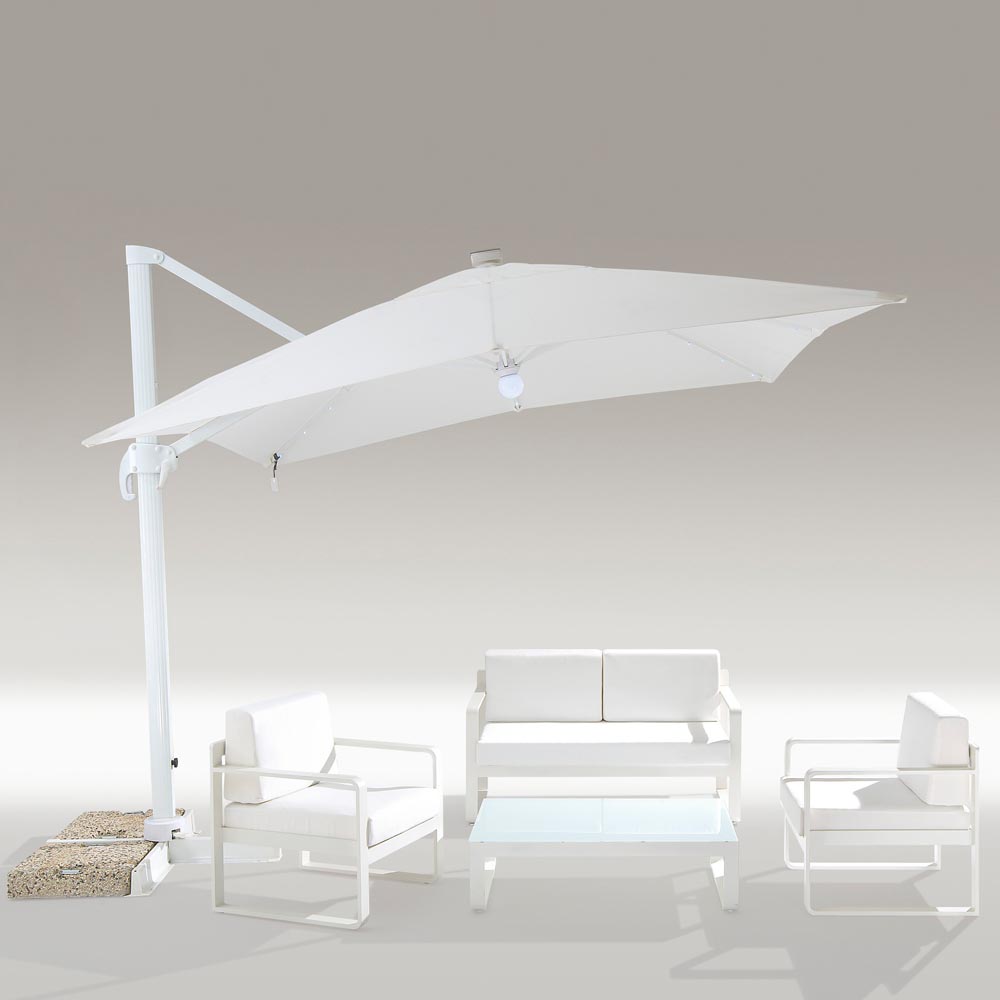 Garnitura Capri, lakiran aluminijast okvir. Garnitura vsebuje z 2 naslonjača, 1 kavč in 1 kavno mizo. Blazine s poliestrsko tkanino vključene.