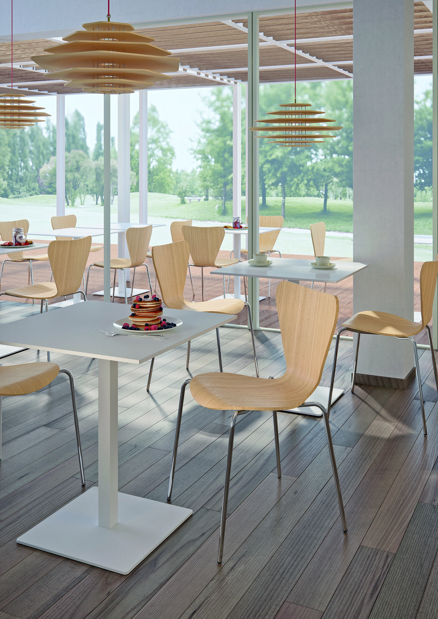 Ukrivljena lupina iz bukovega ali hrastovega veznega lesa, na klasičnem štiri-nožnem jeklenem okvirju, ki je kromiran ali barvan. Na voljo tudi oblazinjena različica v usnju, eko-usnju ali tkanini.