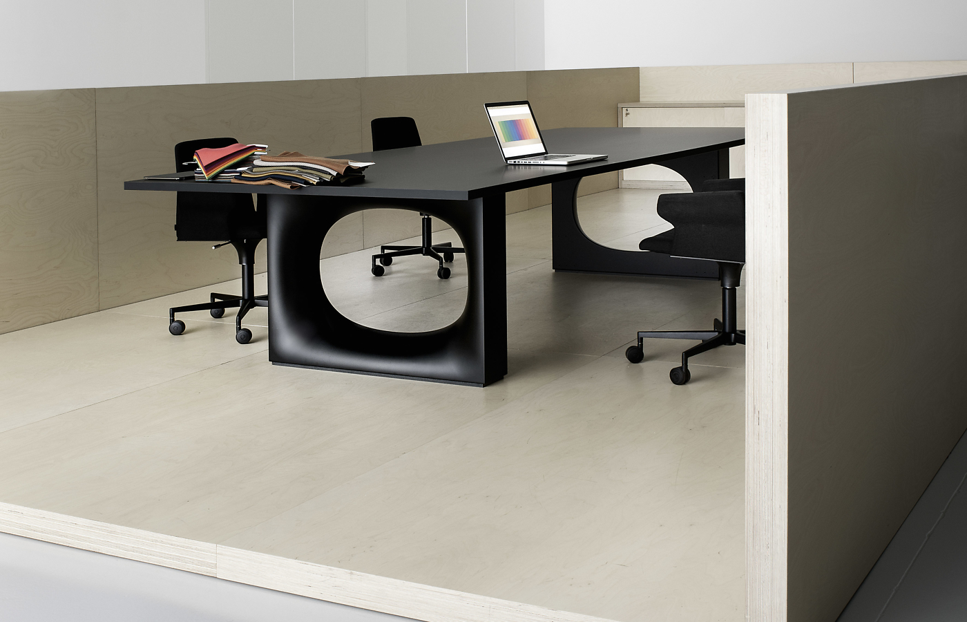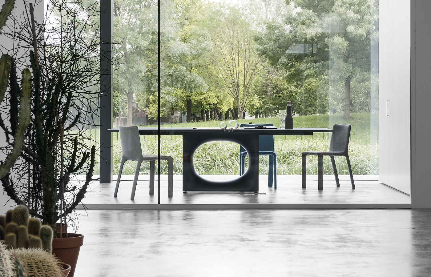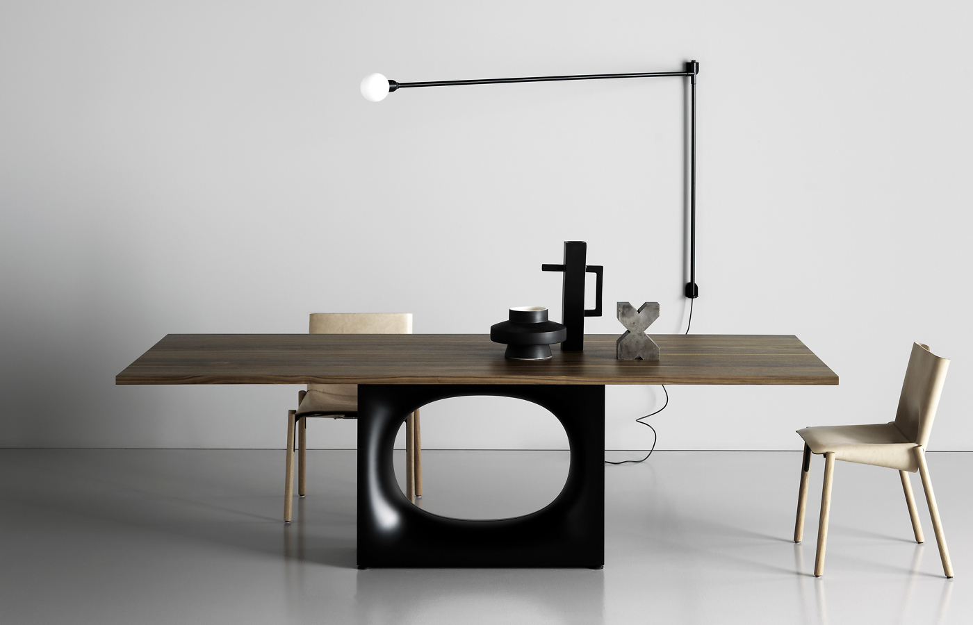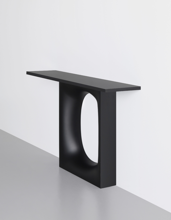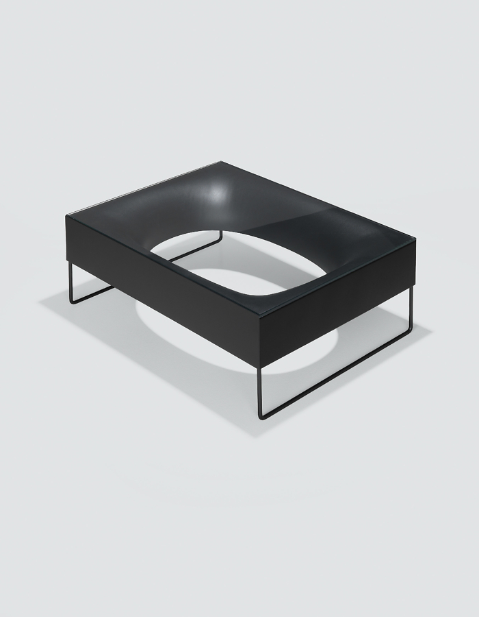 Miza z originalno podlago in ovalno luknjo, z mehko oblikovano obliko v pločevini, izdelana s postopkom, ki vključuje številne faze oblikovanja in upogibanja.