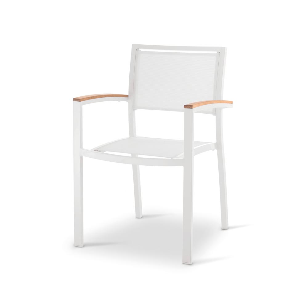 Stol iz aluminijastega okvirja z naslanjačem, prevlečen s tekstilom in lesom.