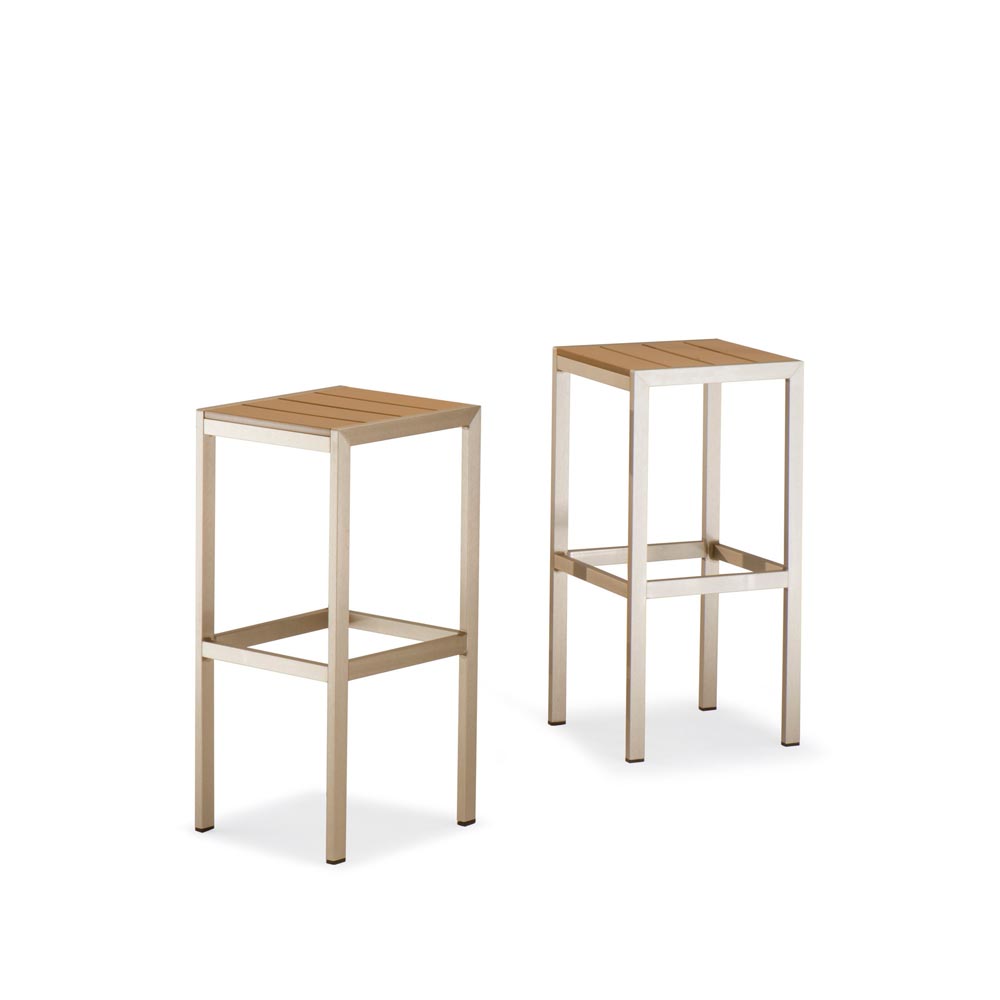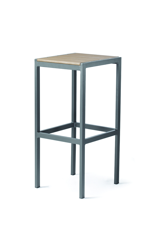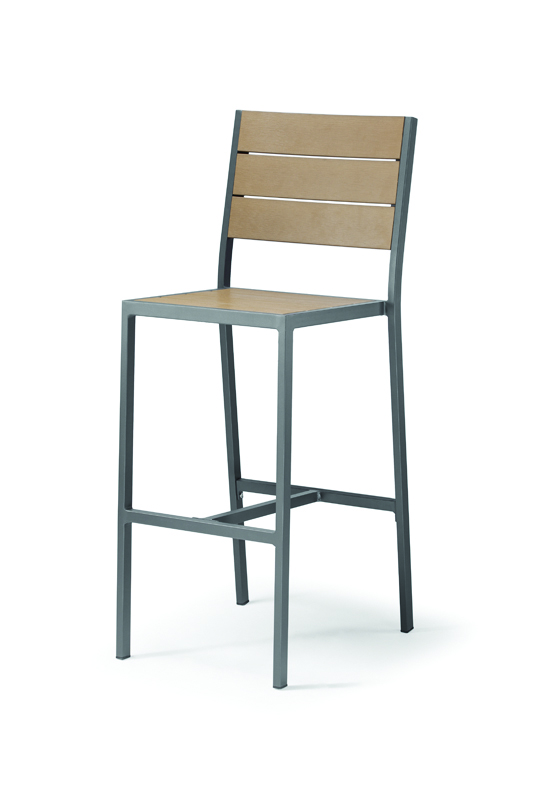 Barski stol iz aluminija z “inox look”, lesene letvice v natur barvi.