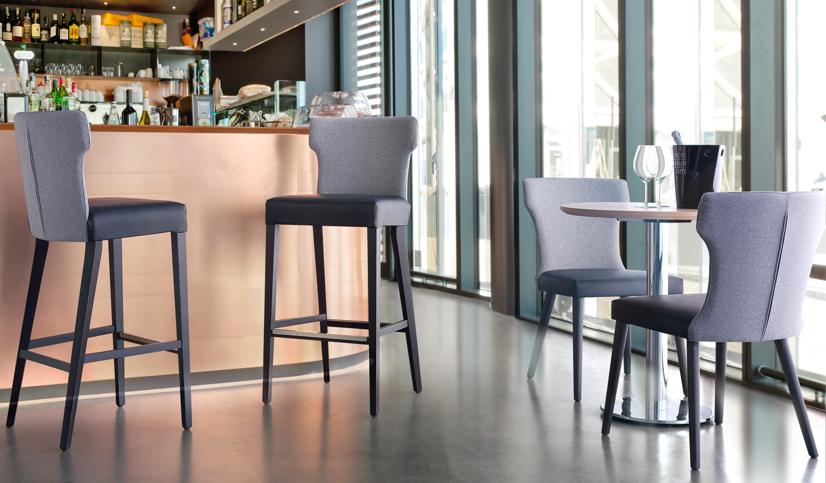Linija stolov pod imenom TESS predstavlja stol in barski stol.Temno obarvane lesene noge, zgornji del stola je dvobarvno oblazinjen, primeren za lokale in bare.
