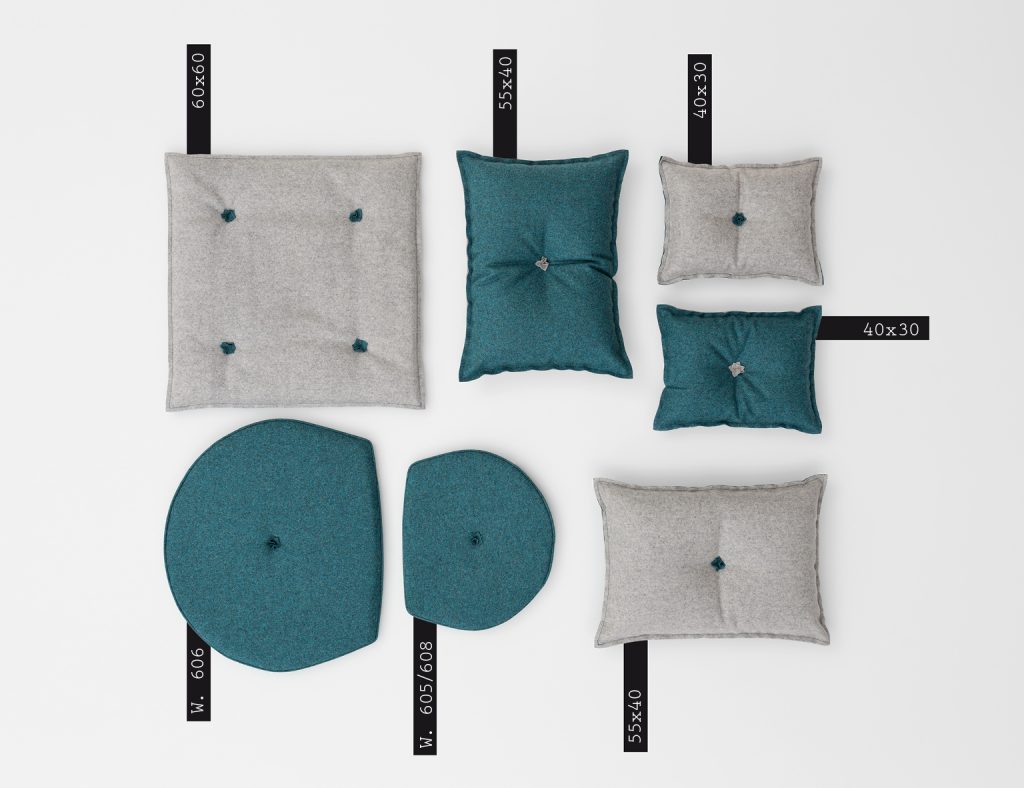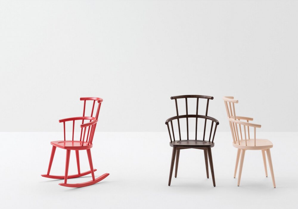 Stoli in naslanjači z imenom W so iz obarvanega ali lakiranega bukovega lesa. Na voljo z blazinami, tudi v različici stolčka za zibanje.