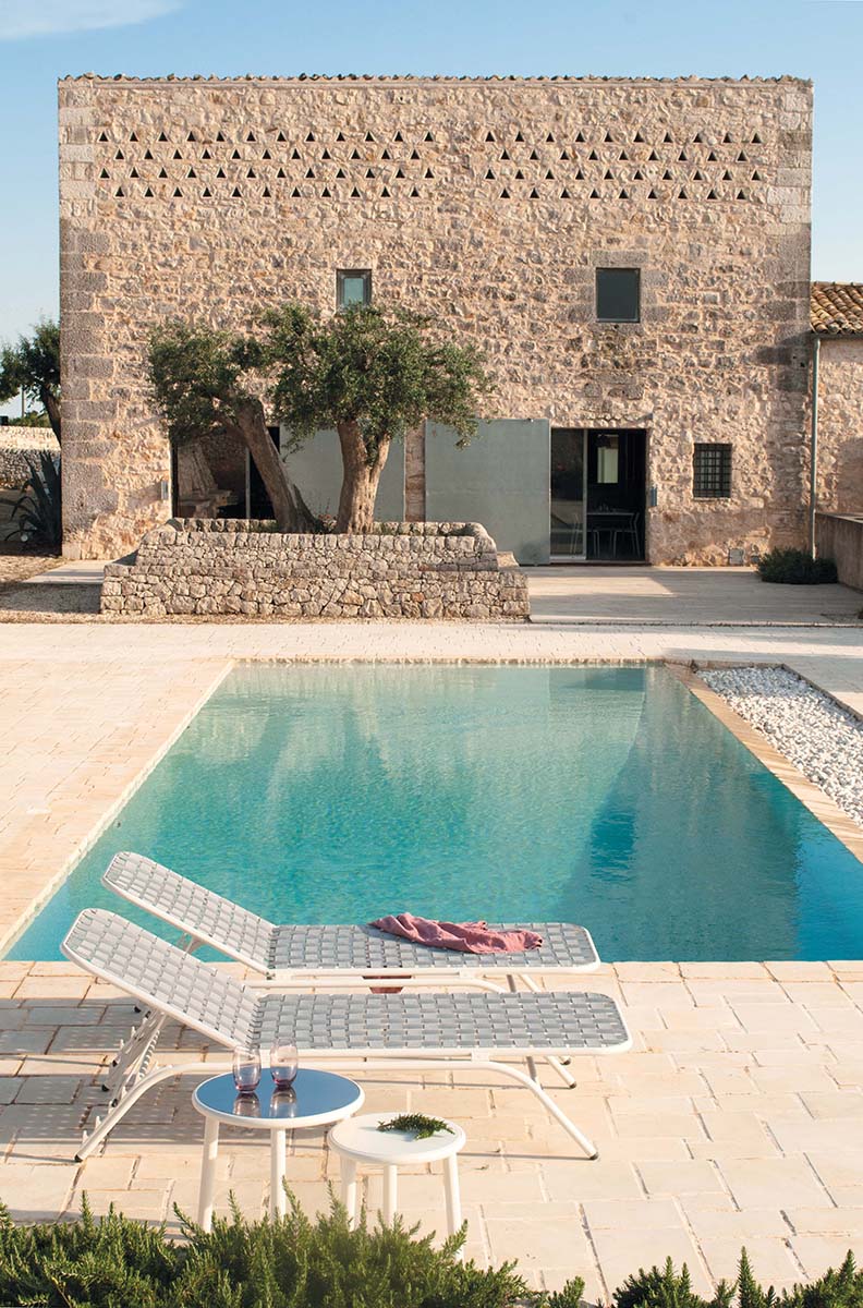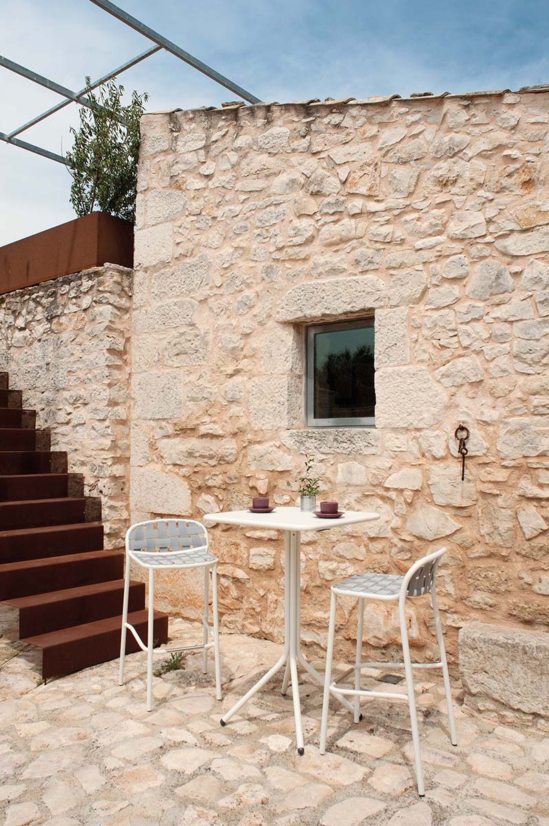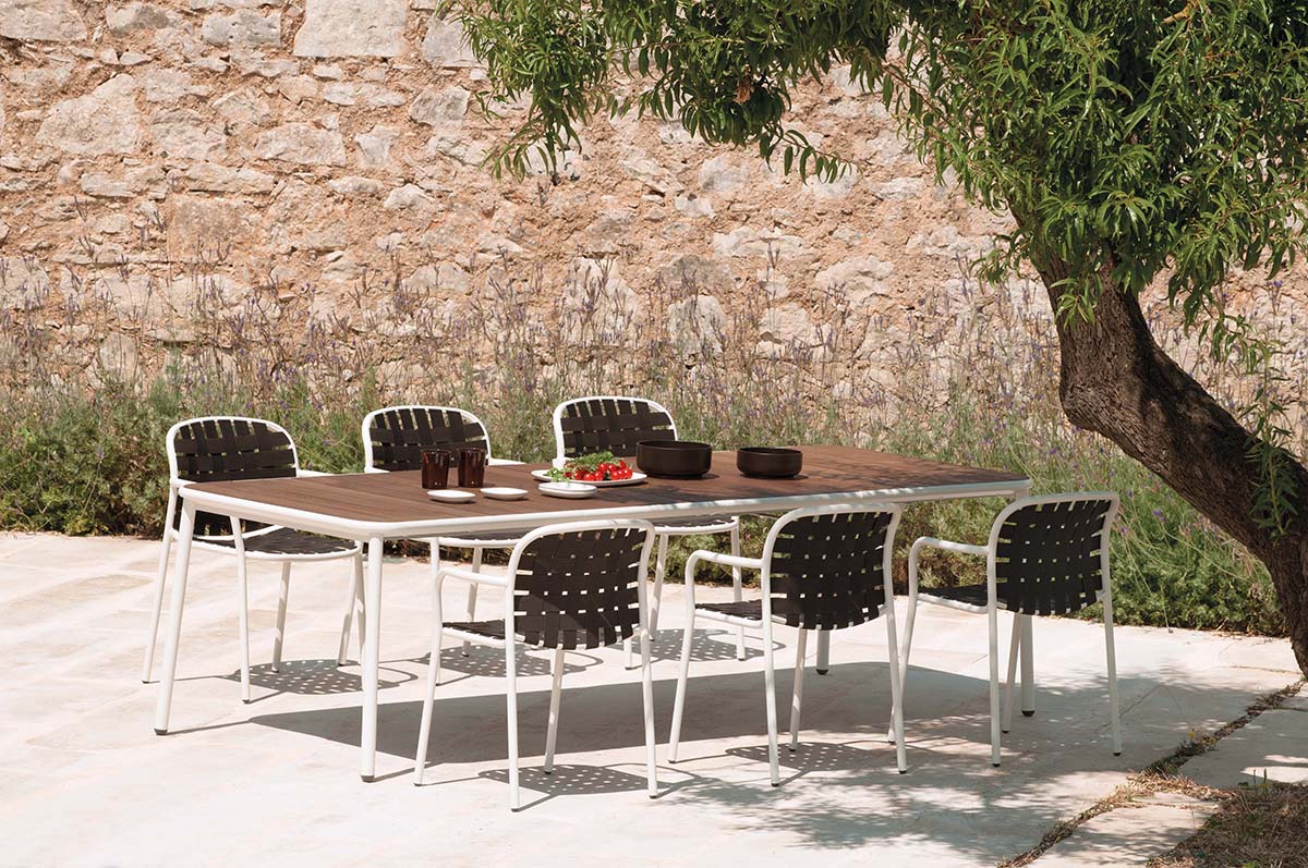 Preplet elastičnih pasov, inovativno povezan z aluminijasto strukturo s prefinjenimi linijami daje kompletu nenavaden slog. Uporaben za zunanjo uporabo. Stol dopolnjuje miza,