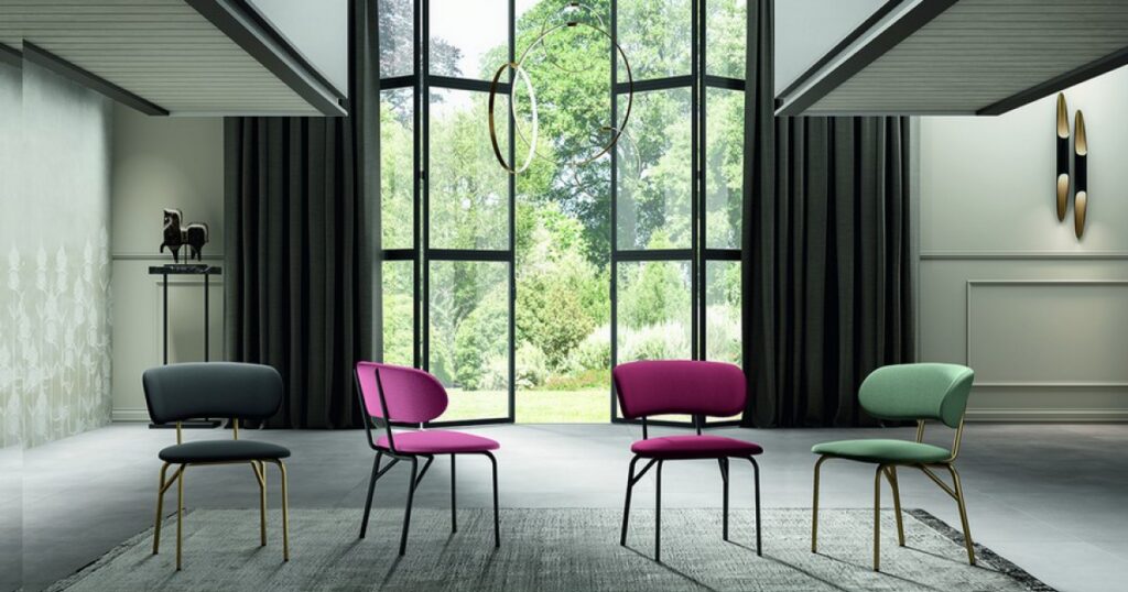 Sedež in naslon stola sta iz vezanega lesa in sta oblazinjena z različnimi materiali.Oblazinjen je lahko v žametu, tkanini ali eko usnju.